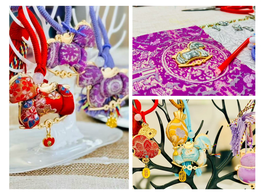 科普结束后,手工创作环节正式开启。老师们化身“非遗手作人”,在讲师的指导下全身心投入宋锦小马的制作。大家精心挑选纹样繁复、色彩艳丽的宋锦面料,精准裁剪出小马的轮廓,搭配精致五金配件,再耐心编织带有流苏的挂绳。指尖翻飞间,穿、剪、粘、编等动作有条不紊,原本普通的面料逐渐蜕变为一匹匹憨态可掬、灵动喜庆的小马挂饰。