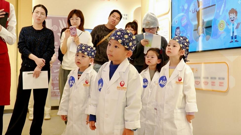 B组则开启了“趣味问答模式”。卡通动画里的牙齿小主角瞬间抓住孩子们的注意力,讲解员抛出的“牙齿会换几次?”“甜食为什么伤牙?”等问题,让现场变成了热闹的答题赛场。小礼品的加持更让孩子们积极性爆棚,纷纷举手抢答,在欢乐互动中把护齿小知识牢牢记在心里。