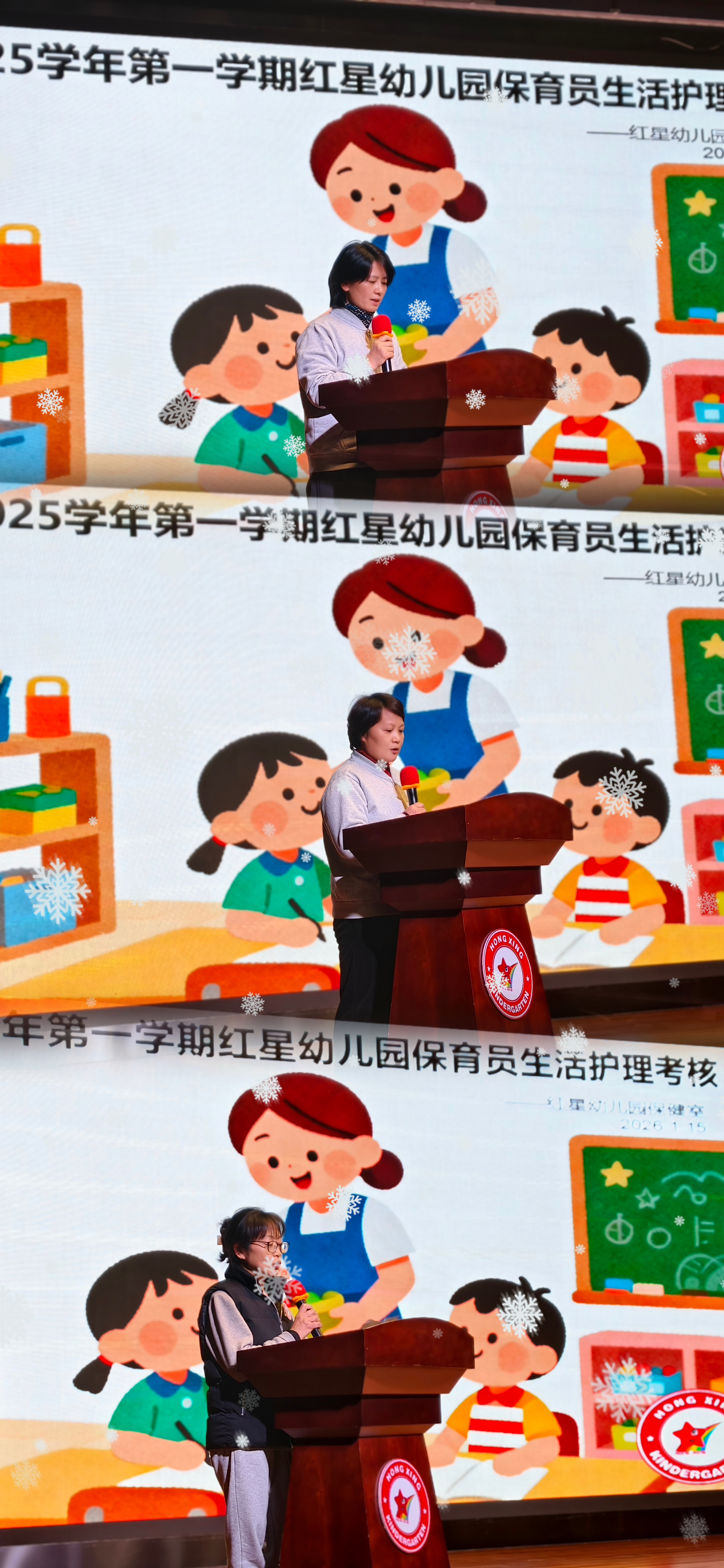 保育员大比武分为一日活动生活护理“案例撰写”与“现场分享”两大环节。本学期保育部围绕幼儿园一日活动中各环节的生活护理进行了专题培训,共同梳理了一套实操的方法。保育员结合日常工作真实场景撰写案例,比武现场,20 位“妈妈老师”依次登台,在3分钟内以讲故事的形式,生动分享了各自的护理经验 —— 从对挑食幼儿的耐心引导、良好习惯的科学培养,到对幼儿情绪的精准捕捉。整场比武不仅是技能的较量,更是经验的交流,让在场者均感收获颇丰。