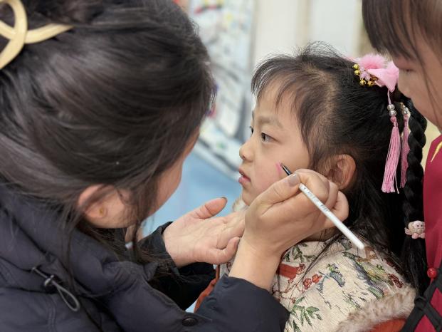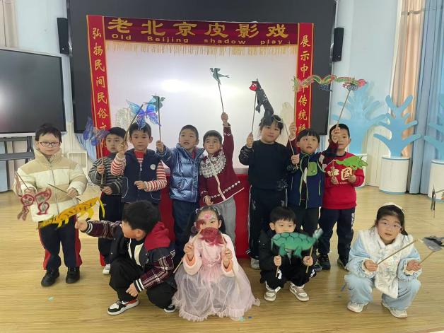 总园中大班则以非遗文化为核心,打造沉浸式传统文化体验之旅。游园活动分时段有序开展,各班化身特色非遗体验工坊,“朱漆画扇”“小小印刷匠”“国粹脸谱坊等体验活动,让孩子们亲手感受漆扇、拓印、脸谱绘制的非遗魅力;“八段锦韵”“蹴鞠逐春,童趣飞扬”带领幼儿体验传统养生与民俗运动的乐趣;“红包盲盒,非遗问答”在趣味答题中加深幼儿对非遗知识的了解。升旗台彩绘、八角亭门口糖画等特色环节,更让孩子们近距离感受传统民间技艺的独特魅力。此外,宝贝们还观看了精彩的皮影戏,通过非遗视频领略传统文化之美,在看、听、做、玩中,种下文化传承的种子。
