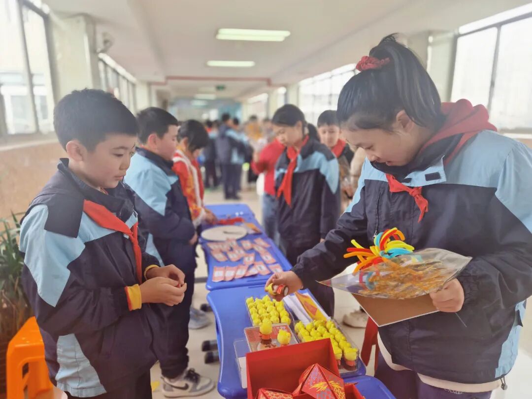 各摊位前人头攒动,热闹非凡。各班学生自主策划的“幸运大转盘”“满减福卡”等趣味活动,引得校园里欢笑声不断;摊位的 “宣传销售组”更是把春节文化融进推销话语:“这盏鱼灯寓意年年有余、风调雨顺,鱼跃龙门的造型还祝大家新学期学业步步高!”这样生动的介绍声此起彼伏。