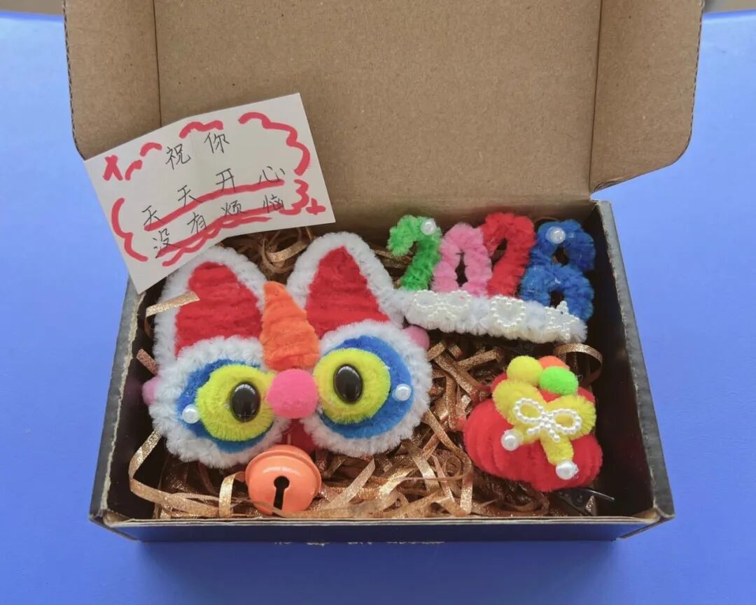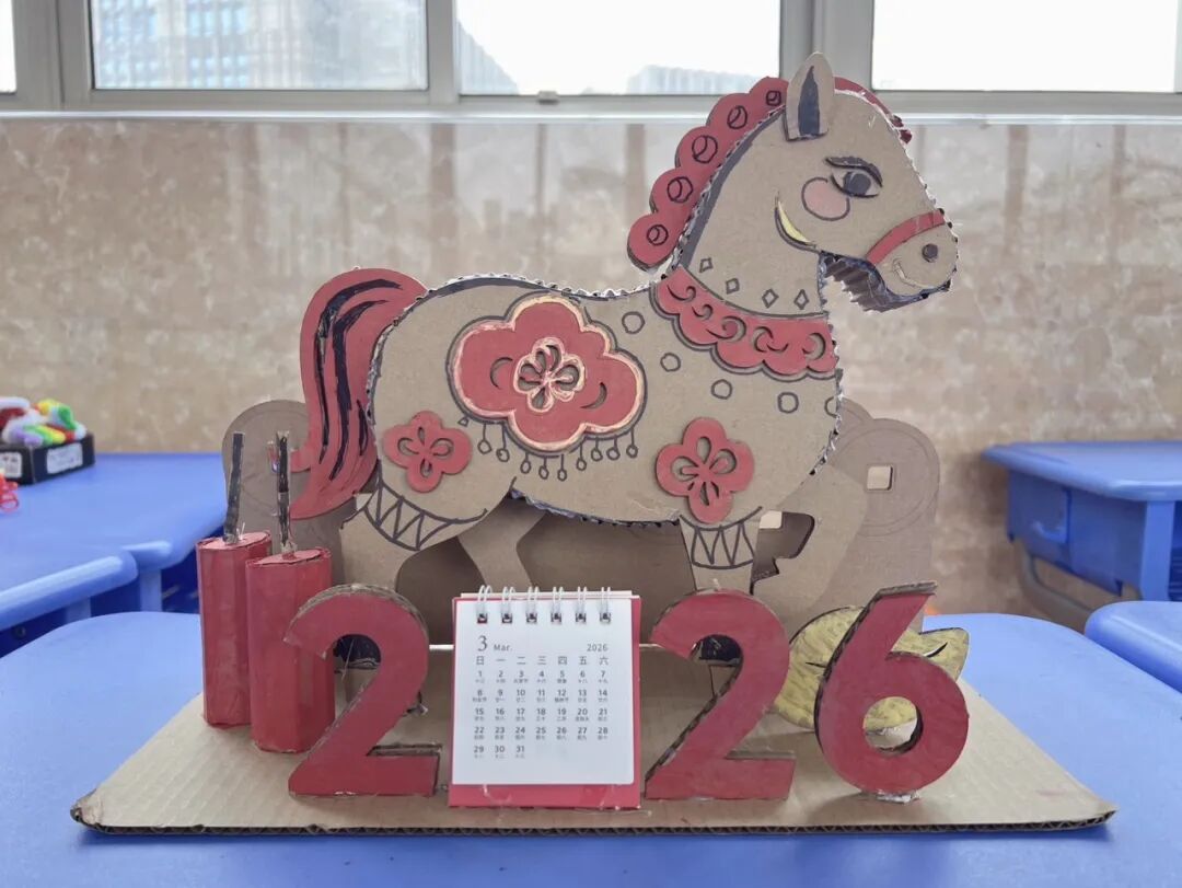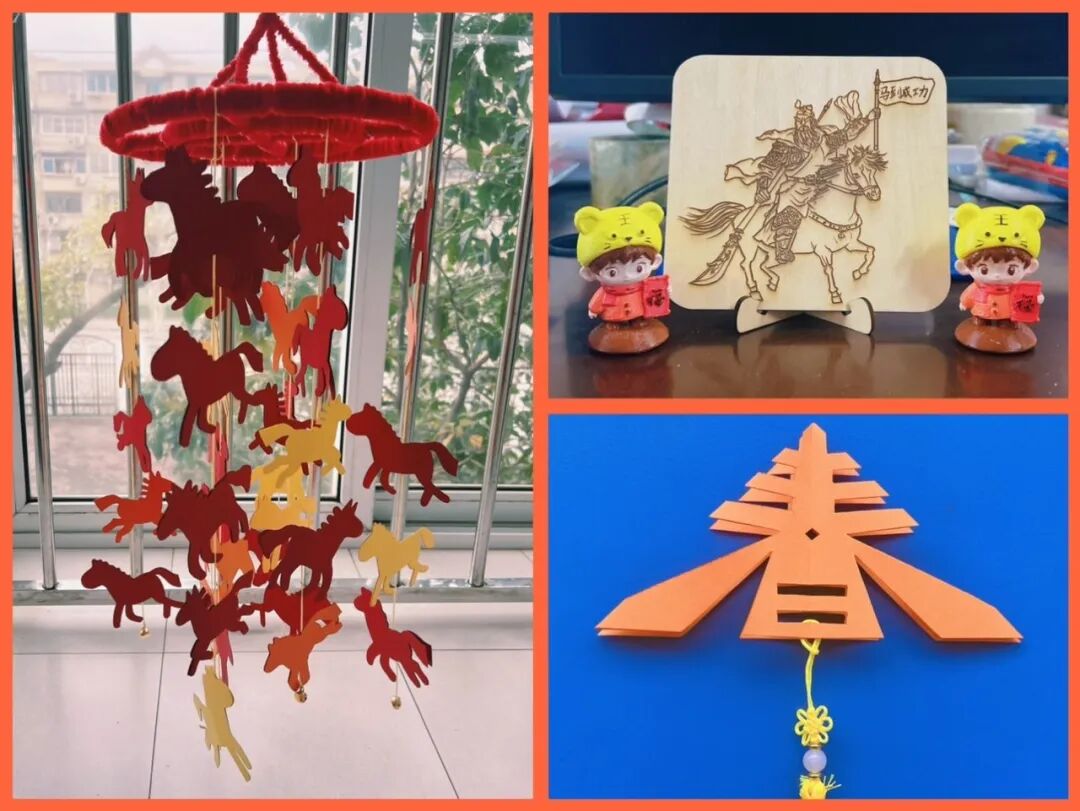 展台上,孩子们上学期反复打磨、精心创作的年礼作品精彩亮相,春联、鱼灯、创意饰品、吉祥挂件、特色文具……琳琅满目的好物,将浓浓春节元素展现得淋漓尽致。孩子们的巧思藏在每一件作品里:有的把十二生肖与传统泥塑结合,设计成贴合当代孩子审美的卡通造型;有的将课堂探究成果“中国历法之演变” 融入马年日历设计,让知识变实用;还有那些难以用传统手工艺实现的创意,在3D打印、激光切割等新技术助力下,从纸上构想变成实实在在的精美物件,成了市集里的热销好物。