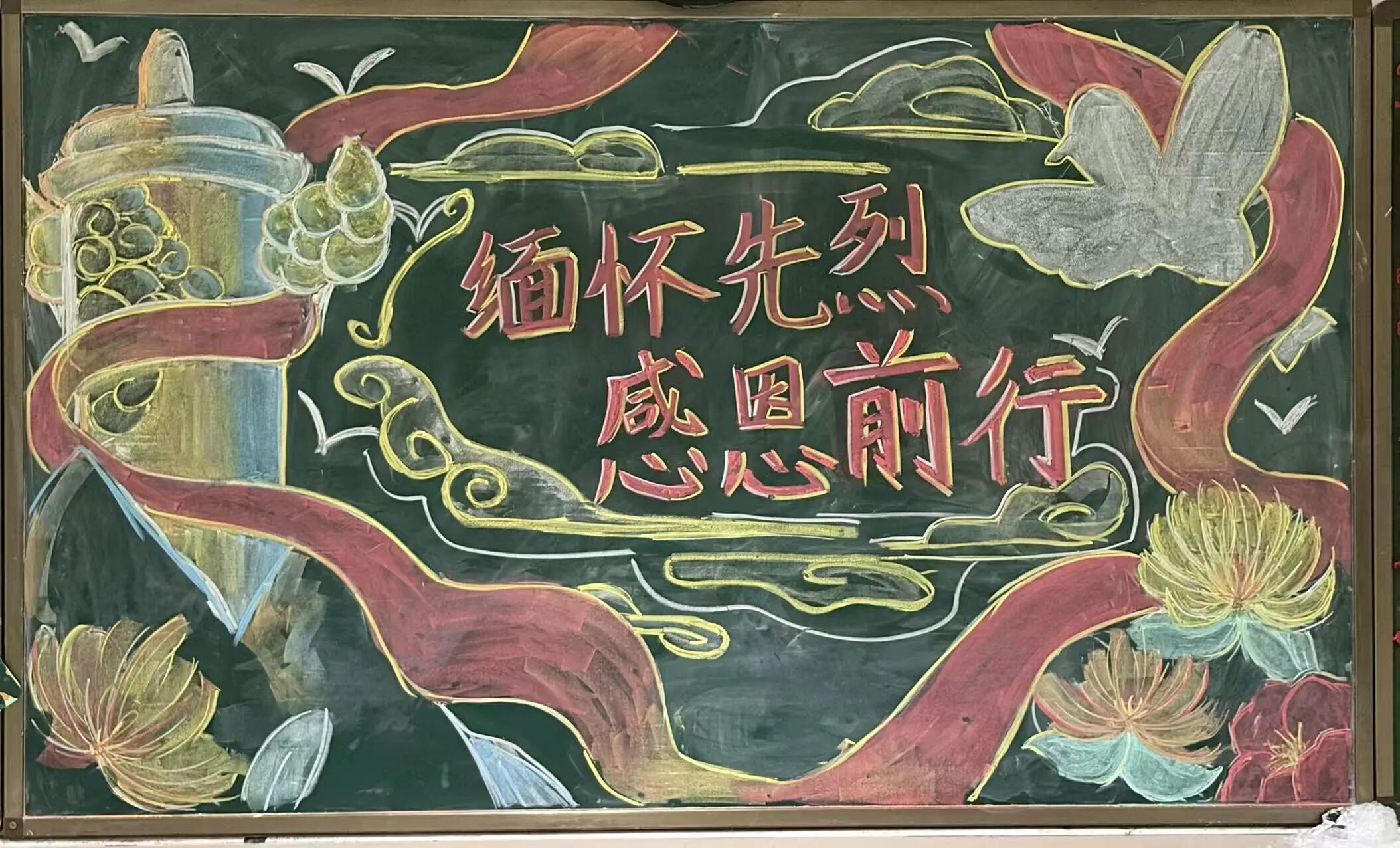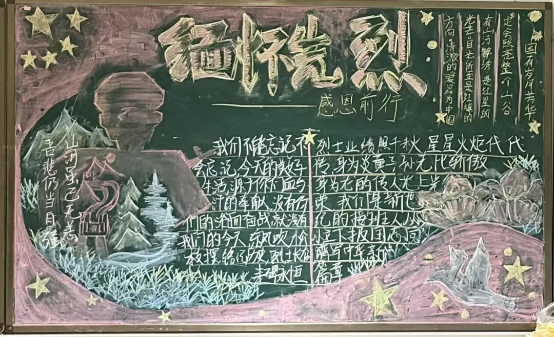 各班级围绕“缅怀先烈,感恩前行”积极筹备、组织绘制了清明主题黑板报,同学们以稚嫩的画笔为媒,以质朴的文字为声,将清明传统习俗与心中感悟融入到板报设计之中。黑板之上,笔墨虽略显青涩却掩藏不住孩子们最纯粹的心意,一句句感恩的话语真挚恳切,字里行间流露着对革命先烈的深切缅怀与崇高敬意。