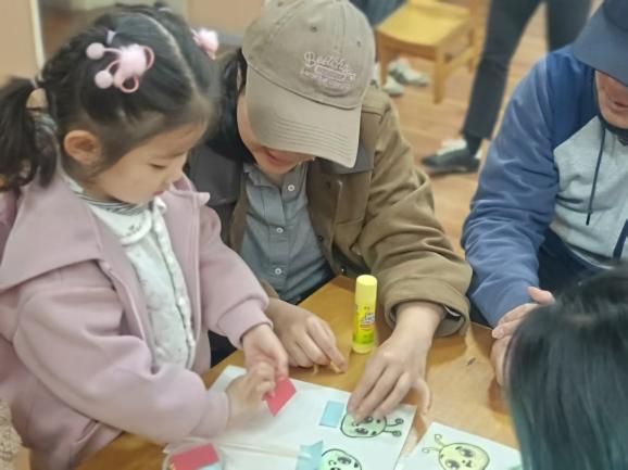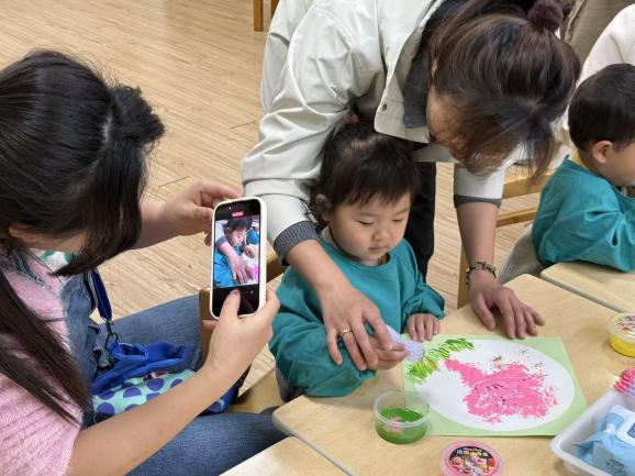 室内乐创环节聚焦精细动作与艺术启蒙,依托棉签、纸团、果蔬切片等生活化材料,设计“圆滚滚的南瓜”“春天的小花”“春天的树”等创意活动,让宝宝在捏贴、拓印、插拔中锻炼手眼协调,感知色彩与自然之美,同时指导家长巧用居家材料,随时随地开展亲子早教。