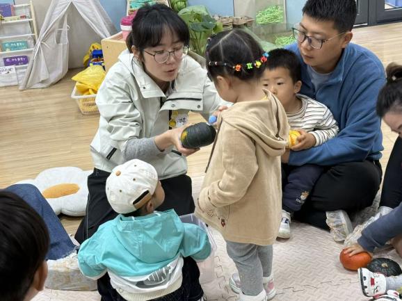 针对12-24月龄宝宝,设置“上海童谣・炒黄豆”“春日种花”等游戏,在韵律互动与动手操作中,锻炼抓握、抛接、粘贴等精细动作,增进亲子情感联结;面向25-36月龄宝宝,推出“趣味彩虹伞"“小动物运粮食”等集体游戏,通过躲、找、爬、跨等动作,提升身体控制与反应能力,萌发规则意识与合作意识。