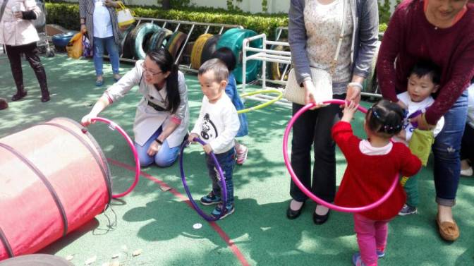 4月29日星期五,住在附近的数十名小宝贝们一大早来参加宝钢九村幼儿园的早教亲子活动,幼儿园的操场上布置了各种运动器具,宝贝们和爸爸妈妈一起参加了体育锻炼,玩得有声有色。
