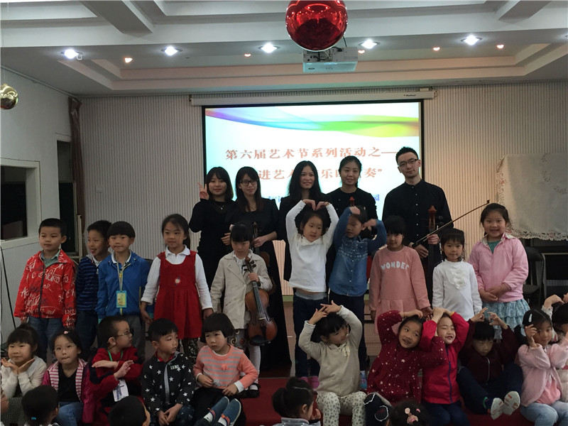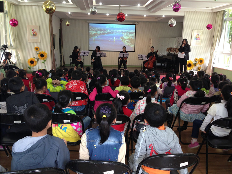 5月10日上午,七色花艺术幼儿园举行第六届艺术节系列活动之——走进艺术,特邀彩虹乐队的乐手们带来精彩的“弦乐四重奏”。彩虹乐队为我们带来《小夜曲》、《蓝色多瑙河》、《幽默曲》、《巡逻兵》、《四小天鹅舞曲》、《快乐农场》、《天空之城》和《欢乐颂》共八首经典乐曲。每首乐曲曲终,乐团老师都会介绍作曲家和乐曲的背景,同时组织孩子们近距离互动。