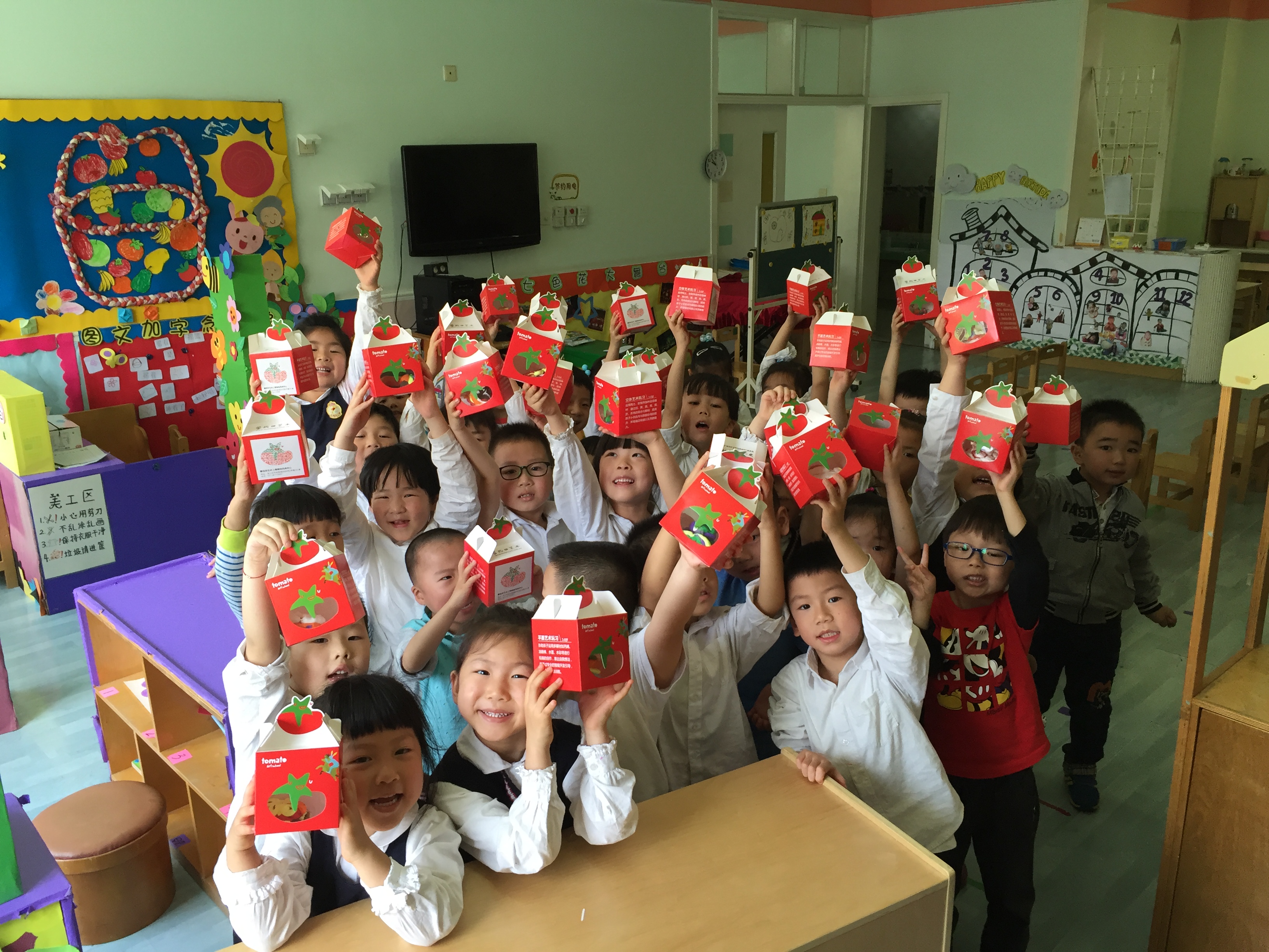 幼儿园请来了番茄田艺术中心的老师,带小朋友们做蛋糕庆祝七色花的生日。