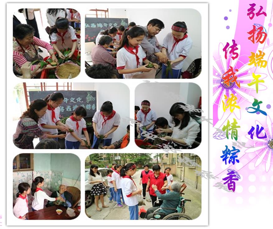 在盛桥居委会,学校四位党员志愿者与社区阿姨们一起包起了粽子,几位少先队员也不亦乐乎地跟着一起学。大家边包粽子边说着端午节的传说,还互相品评各自包成的粽子,屋子里不时传出阵阵欢声笑语,真是其乐融融。粽子煮熟了,学校党员志愿者和社区党支部又带着队员们来到敬老院及社区结对老人家中送上爱心粽子。