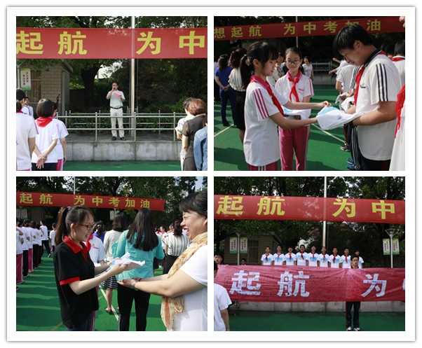 动员大会上,校长书记的殷殷期望,复旦学子王依宁同学的感恩祝福,九年级代表王欣雨同学的拳拳心声,都让人振奋精神,鼓足力量,奋勇前进。而之后,八年级的学弟学妹代表学校为九年级每一位学生老师送上象征梦想的T裇;九年级的全体同学高声朗诵《少年中国说》,最后几百只色彩缤纷的气球飞上了蓝天,在一片欢呼声中,预示着我们的梦想正式启航。