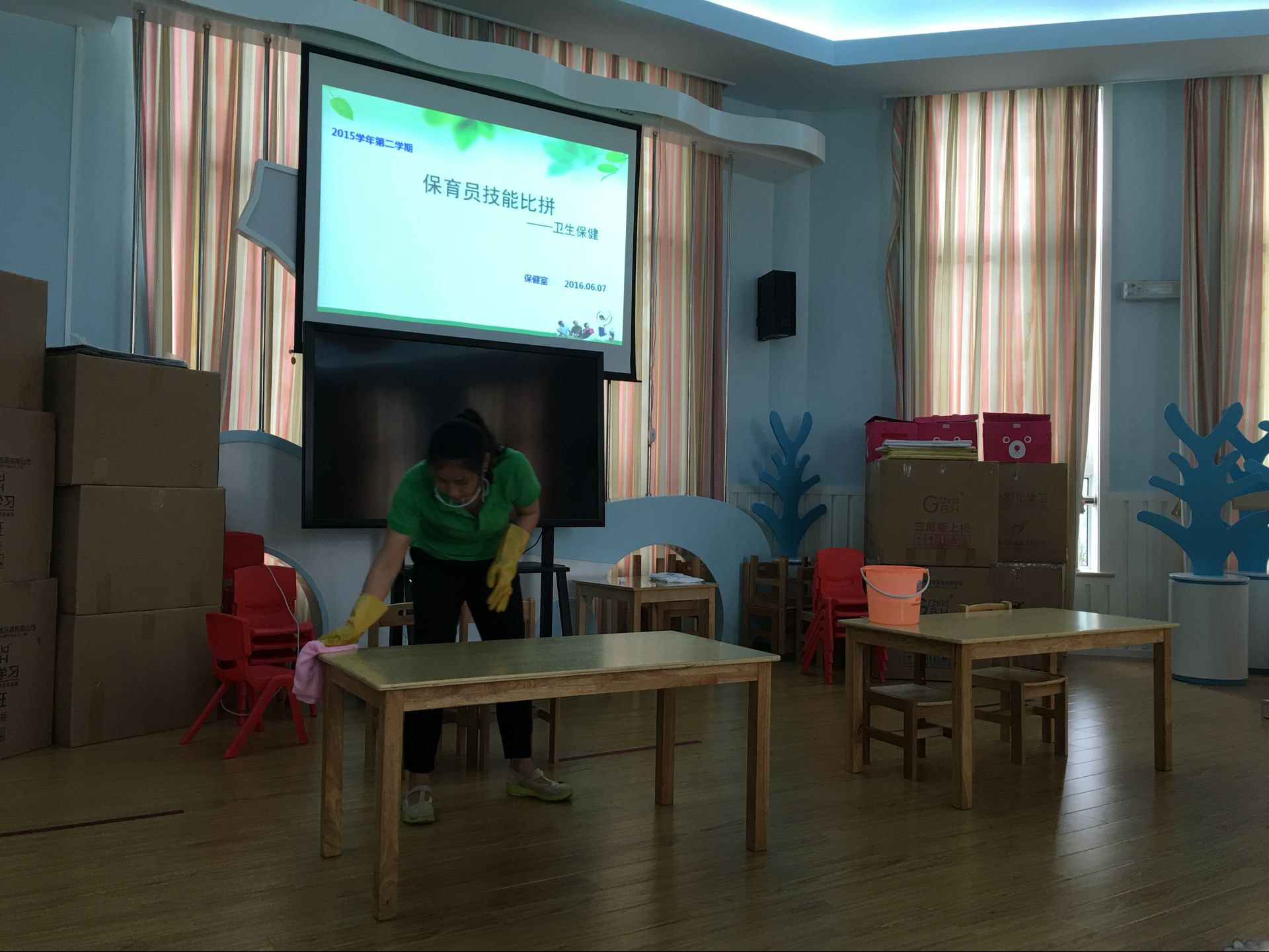 本月我园开展了“保育员技能比拼”活动。此次比赛项目涵盖了保育工作的方方面面,包括规范操作技能比拼(例如:被褥整理、桌面消毒)、头脑风暴、理论知识问答等环节,得到了园领导的一致好评。通过本次活动不仅提高保育员的理论、操作等各方面的能力,塑造一支有实力、有能力、有朝气的保育员队伍,更能调动后勤操作人员的工作积极性,为孩子的学习生活打下了扎实的基础。比赛虽然结束了,但改进和提高幼儿保育的工作还将继续,我们将一如既往地秉承保教一体的理念,不断提高幼儿园保育工作的质量。