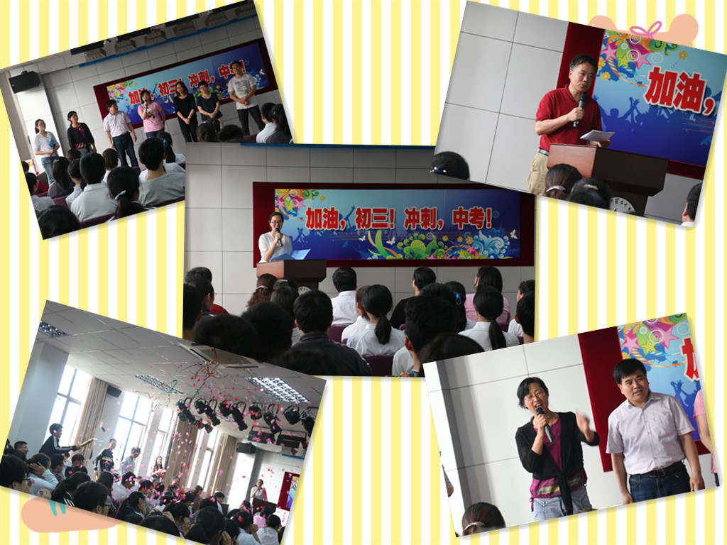 会上,优秀学生干部代表发言,质朴的语言表达了对老师的感谢,对母校的眷恋,对中考的展望。随后,毕业班的全体任课老师为同学们送上最真挚的祝福,学校领导也为同学们送来寄语,激励在座的每一位同学,用乐观的姿态,昂扬的斗志,平和的心态,充足的准备,自信的微笑去接受这次挑战。