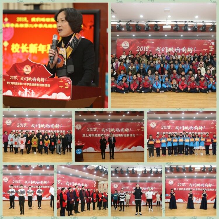 1月4日下午,吴淞二中开展了“2018,我们砥砺前行”总结表彰迎新活动。学校邀请共建单位长一居委、上海市第二康复医院、非遗项目“蔡氏剪纸”传人蔡德福老先生以及家长、学生代表和全体教职工一起欢聚一堂,共同迎接新年的到来。