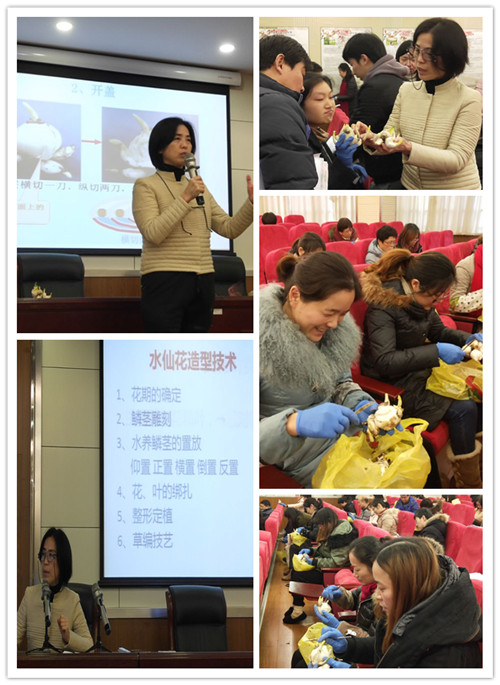 闫莉老师先从水仙的鳞茎解剖结构和雕刻造型原理讲起,一边详细讲解水仙花的雕刻造型的净化、开盖、疏隙、剥苞、削叶、刮梗、雕侧鳞茎和修整等八个基本程序,一边操刀示范,十分耐心细致地向老师们讲解水仙雕刻的要点和注意事项,以及为了控制水仙的花期而在水养中如何浸泡清洗和盆养管理的技巧和方法等等,老师们听了津津有味,每人都手拿着水仙球跃跃欲试。