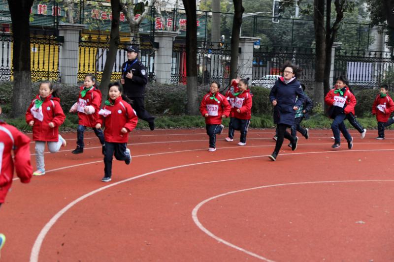 在充分的热身运动后,随着号令声响起,来自各班的10名参赛队员如离弦之箭一般冲出,一同出发的还有泗塘派出所的民警叔叔、学校老师等。运动员们从起点出发,绕操场一圈,随后从学校后门离开,沿着共江路、虎林路、一二八纪念路、爱辉路的路线绕两圈,再回到学校操场,全长4公里左右。