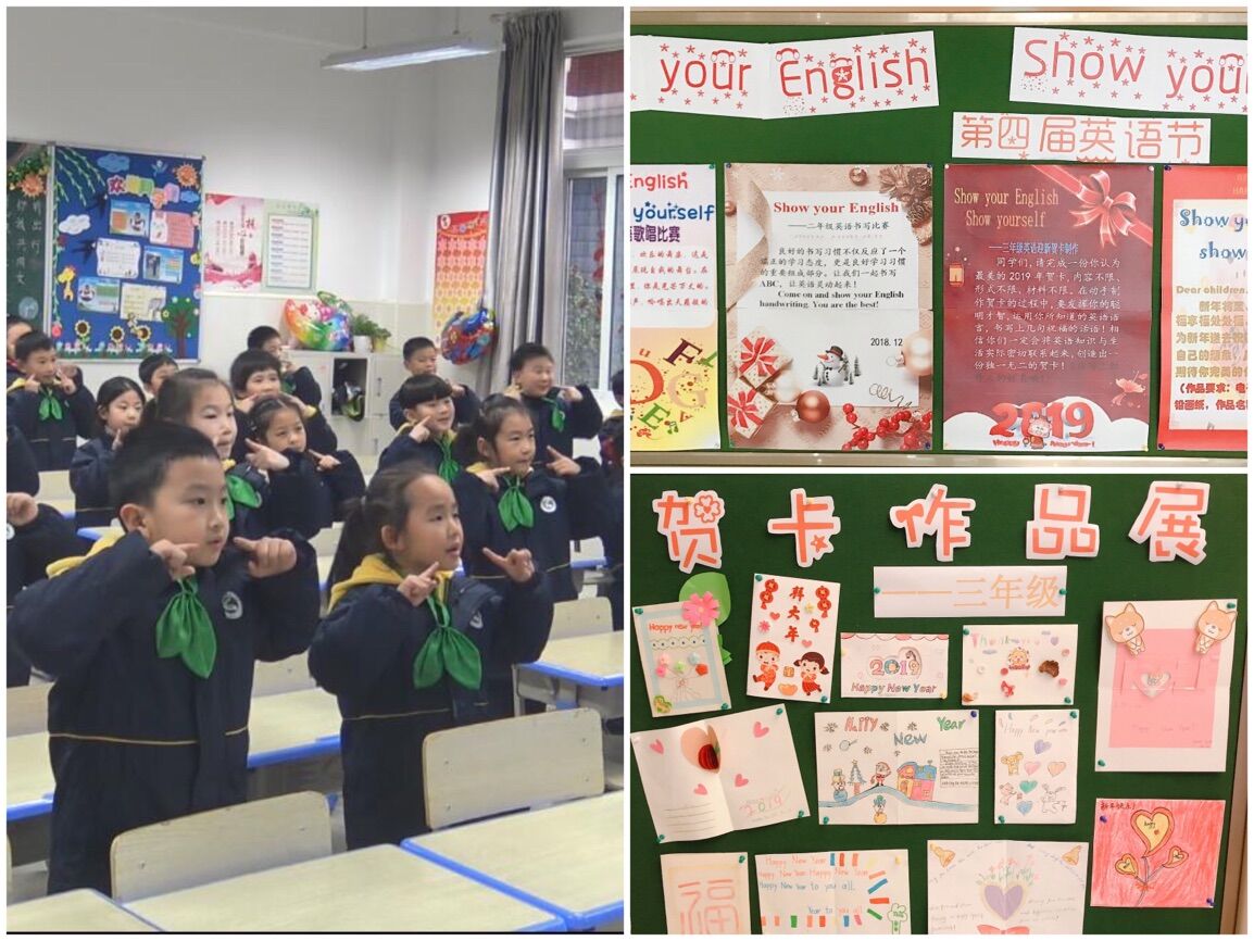 英语组的老师们设计了宣传海报,向同学们宣传了英语周的各项活动。一年级Show“歌曲”的比赛,各班小朋友们积极参与,用优美动听的歌声表达了自己对于英语学习的热爱;在Show“书写”的比赛中,二年级的小月芽们,通过书写单词、句子来展示自己的书写才能。三年级的哥哥姐姐们也不甘示弱,积极参与Show“贺卡”,用自己的一双双巧手和层出不穷的创意制作了一张张精致有趣的贺卡;四年级的大哥哥大姐姐们show出精美的“新年小报”手绘出了一份份自己对于新年的希望和祝福,让老师都啧啧称赞。