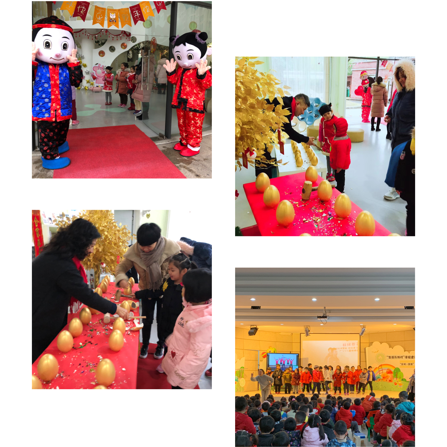 一早,家长、孩子和老师穿着喜气的服装,在门口迎接孩子们的到来,让入园的孩子和家长们惊喜又亲切。小小的金蛋里装着园长妈妈和老师们对孩子的一份祝福,欢乐喜庆的氛围,帮助幼儿调整情绪,高高兴兴上幼儿园。