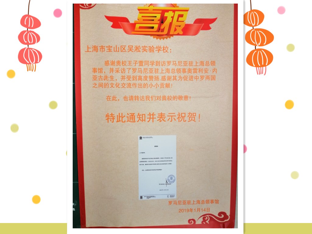 吴淞实验学校小学部王子萱同学到罗马尼亚驻上海总领事馆 ,采访了该馆总领事奥雷利