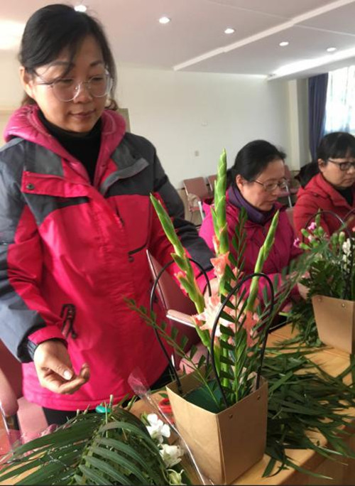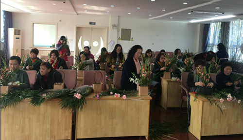 活动当天,我们专门邀请了专业的花艺师前来授课。花艺师从花材的选购、养护开始,深入浅出地介绍了花的流派、花型、花色、造型设计等,让在座的每一位教职工耳目一新。大家认真听取了花艺师的讲解,并在花艺师的现场示范中一个个摩拳擦掌,心驰神往。