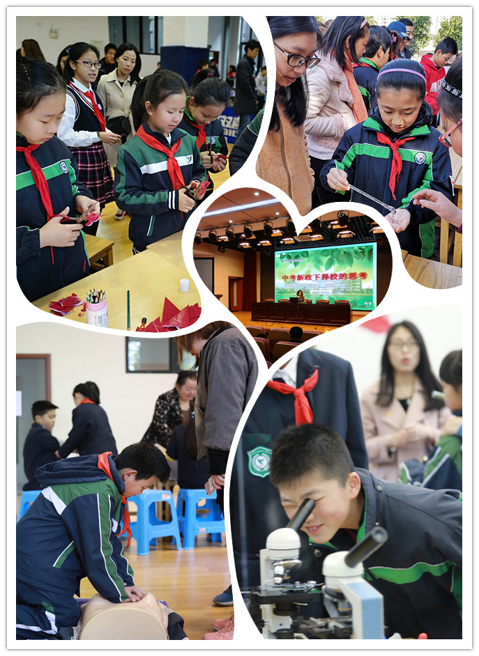 首先,家长和学生在志愿者的引导下通过展板了解学校办学理念、学校课程、团队荣誉、学生活动等,对初中的优秀师资及办学质量有了切实的感受。在活动体验区,我校初中的社团活动吸引了家长和学生的极大兴趣。社团志愿者手把手指导五年级学生近距离体验了各类明星社团活动,如:DIY不织布制作、剪纸、刺绣、电子技术、微观小世界、奇妙化学、电钢琴弹奏、篮球、乒乓、足球、避险救急我能行等等。最后,校方邀请家长和学生共同参加家长会。教导处向家长介绍了上海新中考政策,并结合我校的办学特色及办学质量与家长们沟通了在新政策下如何择校,引起了家长的共鸣,得到了家长的认可。