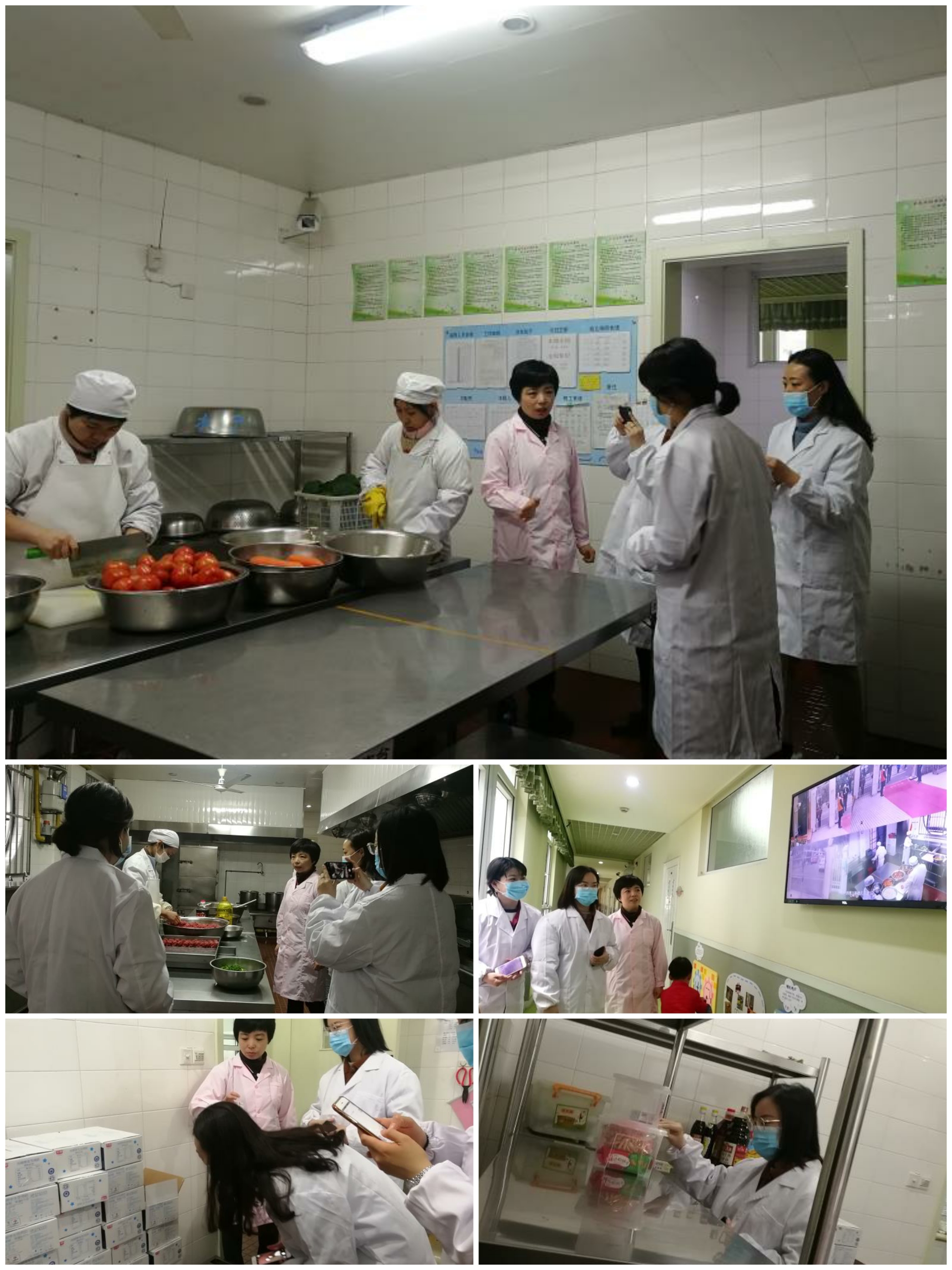 早上8点,三位家长督查换上了白大褂戴上口罩在保健戴老师的陪同下,深入食堂现场,参观了食品仓库、粗加工间、烹调间、备餐间及保育室等区域的环境及设施设备情况,查看了食品留样,食堂制度,食品仓库的管理、包保育间的饮水、消毒等;利用“阳光厨房”视频监控,观看了厨房人员规范操作情况,了解食品加工的流程。最后督查也向保健老师了解了幼儿每周伙食的营养搭配,家委会三位督查一致对幼儿园食品安全工作及厨房卫生工作所做的公开、细致、规范,给予了充分的肯定,纷纷表示对孩子在幼儿园的饮食感到非常放心和满意。