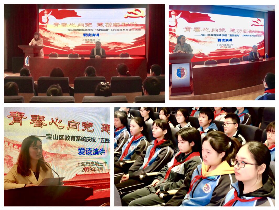 结合宝山区教育系统庆祝“五四运动”100周年系列读书活动学校党支部将本次活动分为“青春心向党·建功新时代—爱读演讲”及“青春心向党·建功新时代—爱读分享”活动。三位青年党员教师代表热情高昂,激情四射地向团员们讲述阅读经典后在思想中激起的火花,在内心里泛起的涟漪。