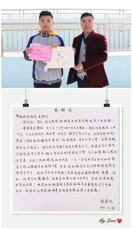 上月中旬,八(1)班张浩斓同学在回家途中捡到一个皮夹,内有现金、银行卡、洗车卡等卡券,价值几万元,还有各种重要证件。张同学告知父亲一定要将钱还给失主,且没有留下姓名及联系方式。失主非常感动,通过多方询问,终于找到张浩斓同学所在的罗店中学,并赠以感谢信。失主在信中称赞了张同学的优良品质:“本人的感激之情难以言表。在这个物欲横流的时代里,一个八年级的学生能有如此拾金不昧的精神实在难能可贵。”