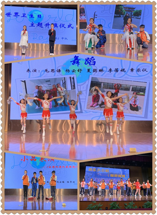 首先由两位主持人向大家介绍了“世界卫生日”的时间和由来,随后由三位学生表演了小品《校园环境从我做起》,使在场的同学们深刻体会到卫生环境对大家日常生活的重要性,更是让同学在笑声中懂得了人人讲卫生道理。除了要讲究环境卫生,有好的生活卫生习惯以外,精神卫生在如今也尤为重要。同学们在舞台上表演的钢琴独奏、啦啦操、二胡合奏等。精气神十足,让台下的同学听得如痴如醉,给人以极大的精神享受,充分展示孩子们健康向上的课外生活。最后全体队员的大合唱《咖喱咖喱》,节奏欢快,表演到位,更是把整场演出推向了高潮。