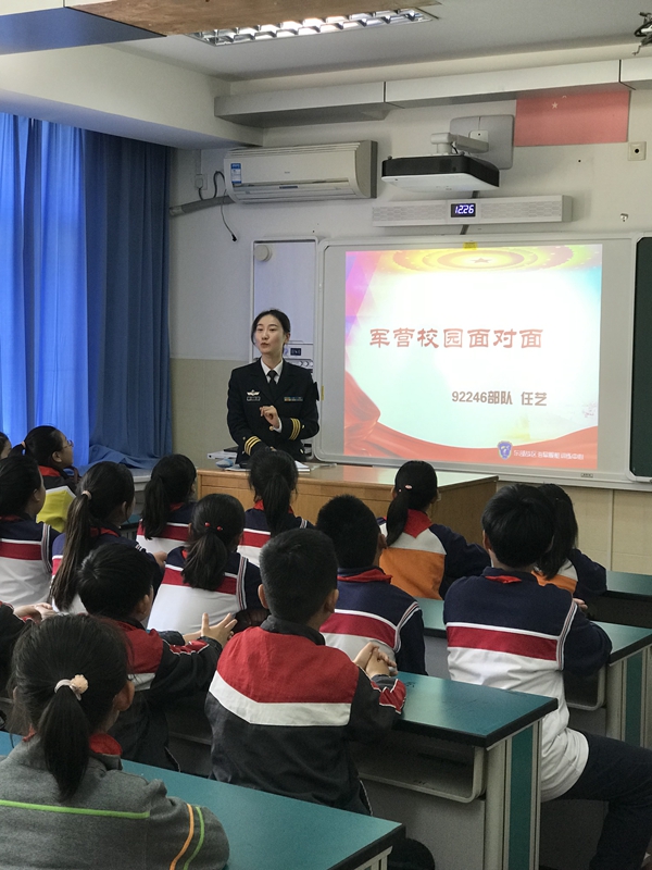 4月18日中午,海军部队的任干事来到我校,为我们五年级的同学带来了一场别开生面的国防教育讲座——军营校园面对面。