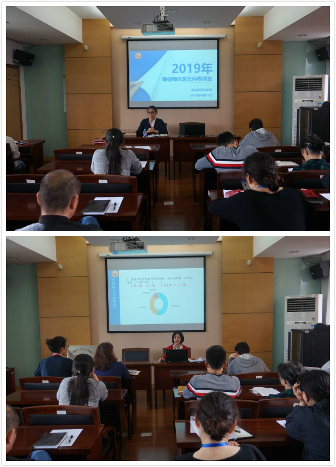 首先,教导主任滕老师就学校2019年师德师风家长问卷情况和推进学业质量绿色指标评价学生问卷进行了全面而细致的分析。滕老师肯定了教师们在教学教育工作中兢兢业业的付出,用爱心、耐心与责任心换来了孩子们的进步,得到了家长们的赞扬。同时她也指出个别教师在关注全体、作业分层、培养学生自主学习能力等方面存在的不足。她希望老师们能立足学情,把握学科教学基本要求,认真学习各科《课标》与《教学设计指南》,活用教材,用活教材,进一步培养学生的学科核心素养。