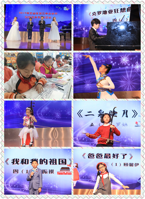 学生的才艺点亮了校园,彩泥、书画等优秀作品精彩亮相于学校底楼的大厅里,真是学校一道亮丽的风景线,让老师与学生不由自主地停下脚步欣赏。闭幕式上,简短而隆重的颁奖典礼之后,艺术节汇报演出开始了:二胡独奏《人勤春来早》、《二泉映月》等曲子饱含感情,乐声如痴如醉,让人沉醉其中。钢琴演奏《共产儿童团团歌》、《克罗地亚钢琴曲》高亢激昂,指尖在琴键上飞舞,乐声久久在耳边回荡。歌曲《爸爸最好了》、《我和我的祖国》等唱出了孩子们爱家人、爱祖国的心声。舞蹈《啊!草原》带大家遨游美丽的大草原,仿佛身临其境,感受到大草原的辽阔与壮观。