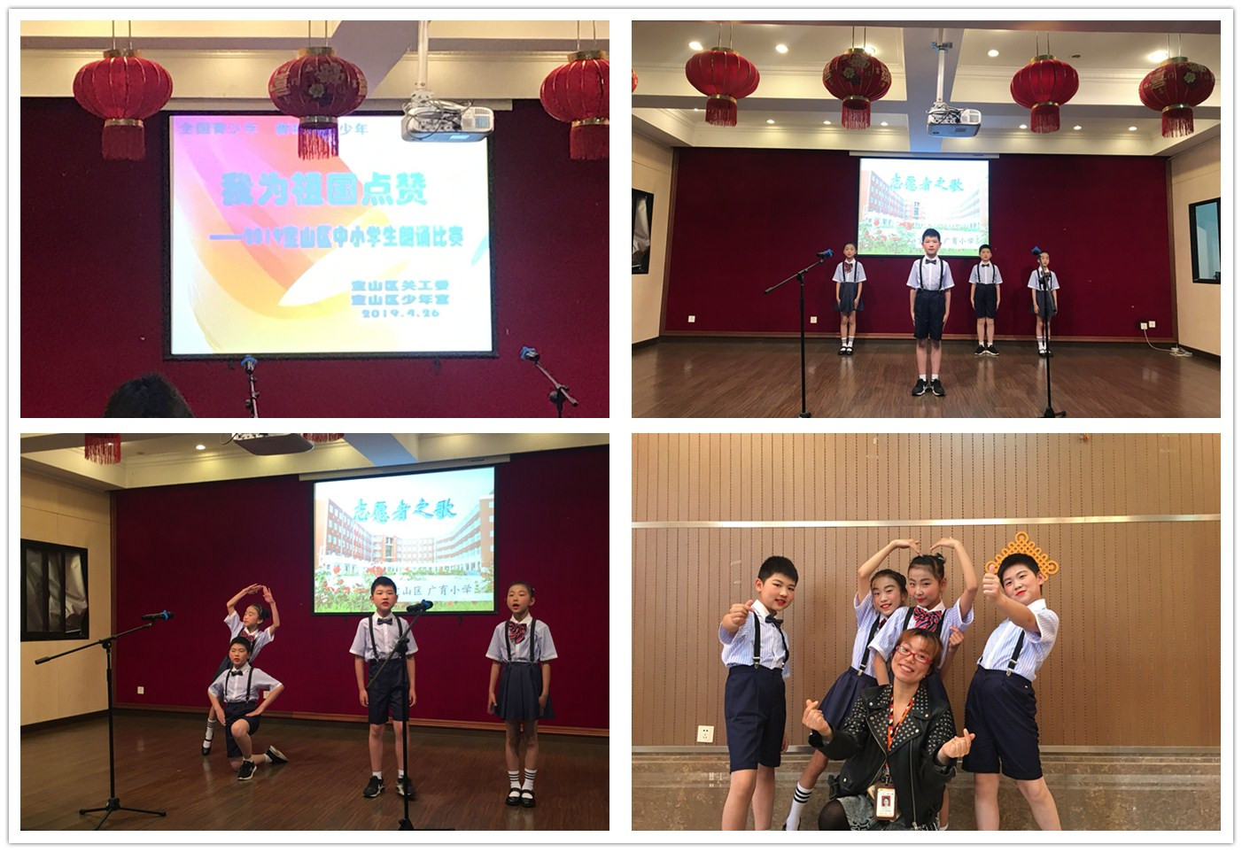 4月26日下午,广育小学四(6)班谢明桥、金哲羽、杨宸宇、周嘉慧四名同学在班主任张敏老师的带领下来到宝山区少年宫,参加“为祖国点赞”红读朗诵比赛。全区50多所中小学校参赛。