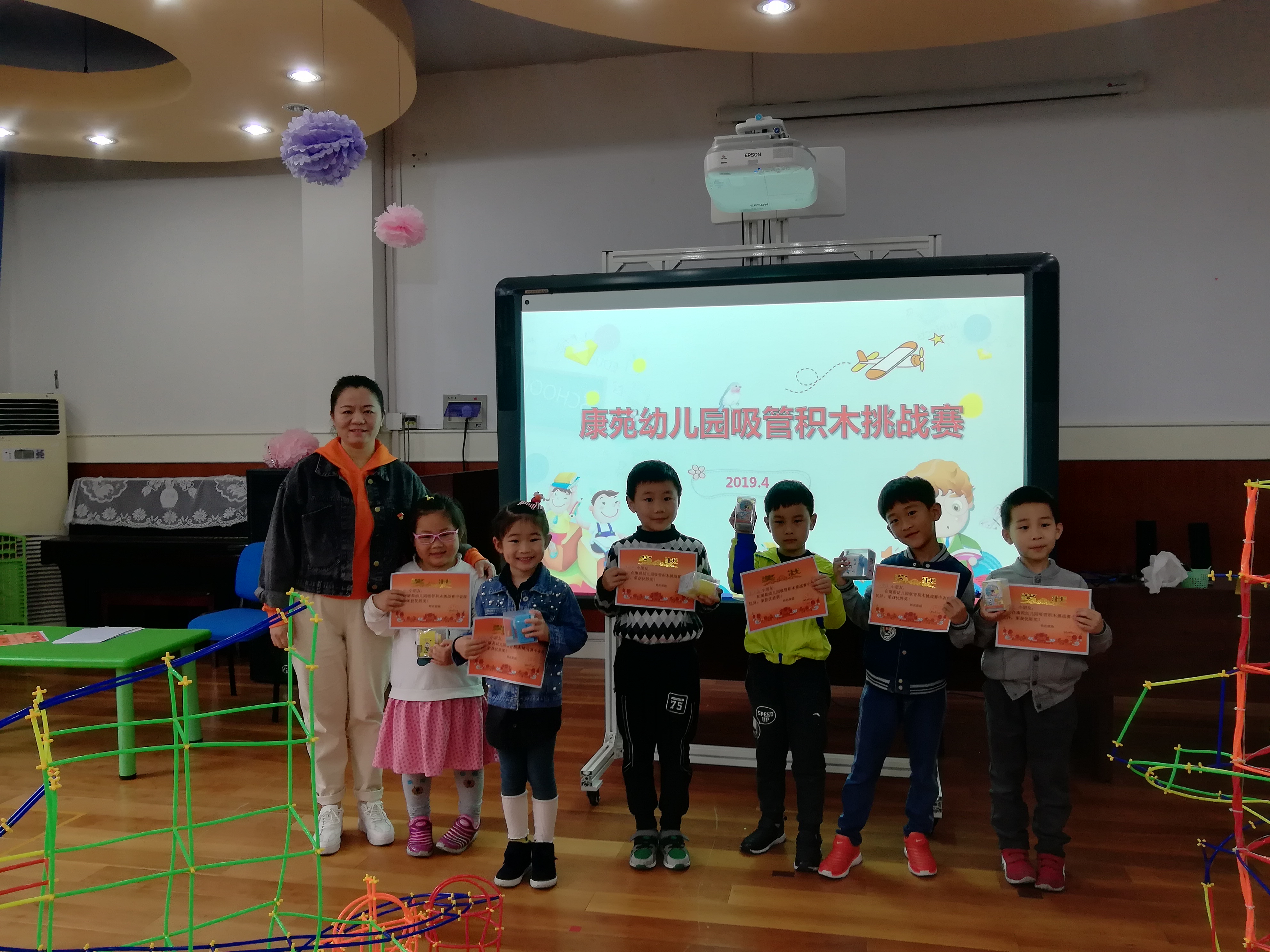 本次比赛经过前期的班级宣传和初选现共有8个家庭参赛。首先由主持人徐丹老师介绍活动规则,随后孩子们和家长们进行紧张的设计和拼搭。选手们个个聚精会神,每个小接口都丝毫不敢懈怠。一个多小时的比赛在不知不觉中结束了,当主持人宣布比赛结束时,一座座各具形态的“吸管结构”矗立在地面上,孩子们对自己的作品也做了精彩的介绍。经过评委老师的一番测试比对,最终有两名小朋友获得了“建构大王” 称号,并代表幼儿园参加区比赛。