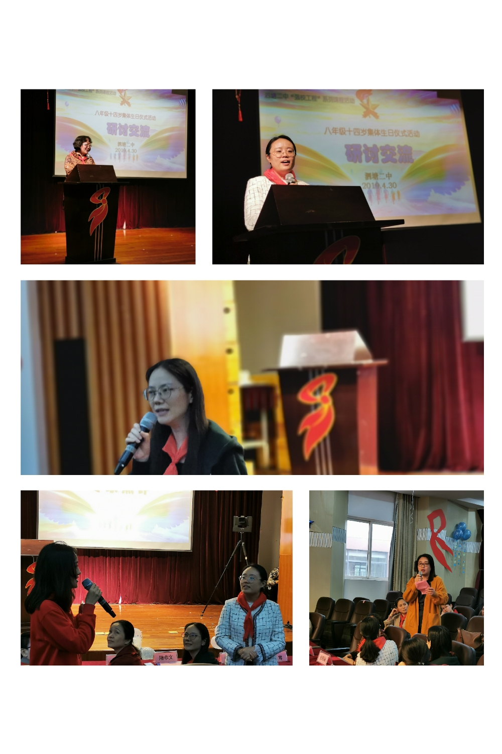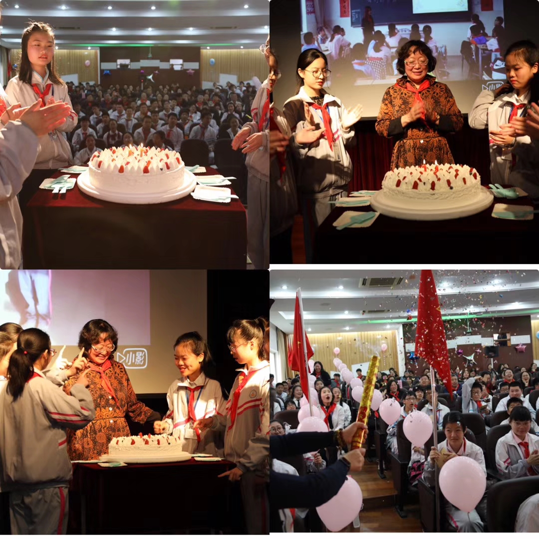 社团展示结束后,所有嘉宾和队员齐聚二楼阶梯教室,举行了八年级十四岁集体生日仪式活动,庄严的队仪式后,“十四岁的舞台”——各中队风采展示、“十四岁的向往”——宣读新团员名单、“十四岁的祝福”——辅导员祝福以及家长代表祝福、“十四岁的誓言”——《致十四岁》、“十四岁的畅想”——《明天会更好》、“十四岁的甜蜜” ——分享生日蛋糕等六个篇章将现场活动推向一个又一个高潮。