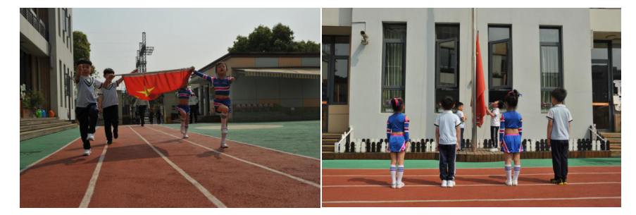 小升旗手们抬头挺胸,将国旗高高地举起,踏着有力而坚定的步伐走向升旗台。在嘹亮的国歌声中,全园师生、家长们注视着五星红旗冉冉升起,一起高声歌唱《中华人民共和国国歌》。