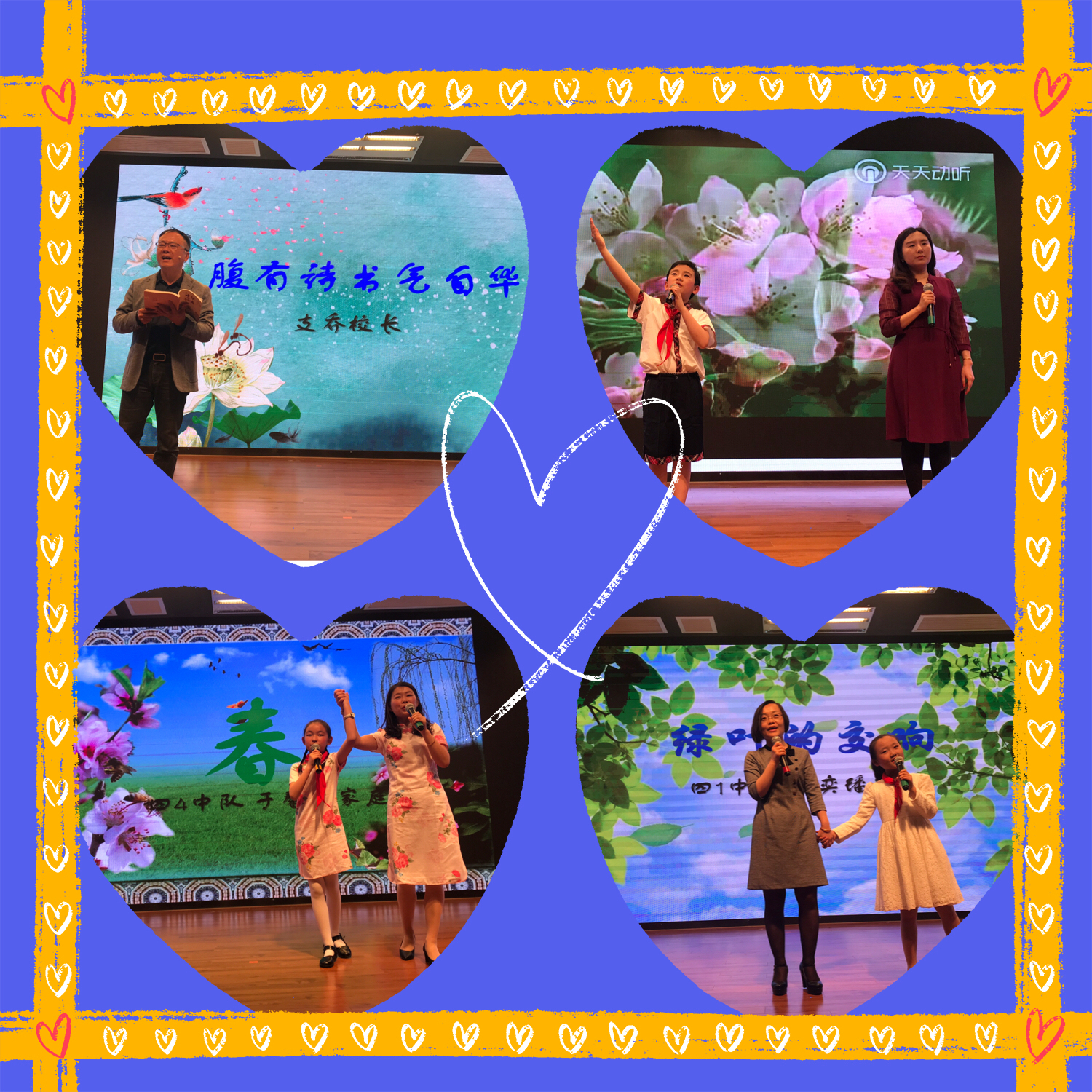 四(1)班的一曲表演唱《秋夕》,让人从中感受到了这首诗构思巧妙,感情蕴藉婉约,强烈的艺术感染力。四(2)班声情并茂地演绎了一曲《明日歌》,别出心裁的母女、父子对白,朗朗上口的旋律加上学生们整齐划一的动作,赋予了这首古诗新的生命力。四(3)班的一首《少年中国说》,诵出了天地苍苍、乾坤茫茫,中华少年顶天立地当自强的气势,歌舞表演的融入更显现出了当代中华少年的意气风发,把活动推向了一个高潮,赢得满堂喝彩!四(4)班的朗诵表演《让我们一起读书》让人感受到了什么叫做腹有诗书气自华。
