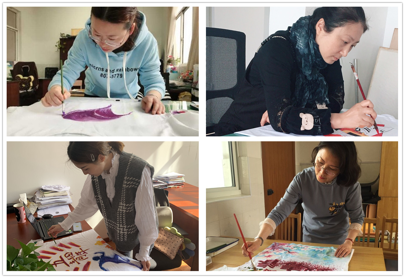 在支逸飞、贾英杰老师的带领下,美术组全体教师和蔡丹丹、施诗、顾美玲、施嘉意等青年教师在繁忙的工作之余积极参与T恤的绘制,大家都发挥自己的想象力,认认真真地在白色体恤上作画,通过大家的手绘,原本一件件平淡无奇的白T恤在老师们的手中变得生动起来。最后,每位老师都出色地完成了自己的作品,充分展示出了广育青年教师的风采。