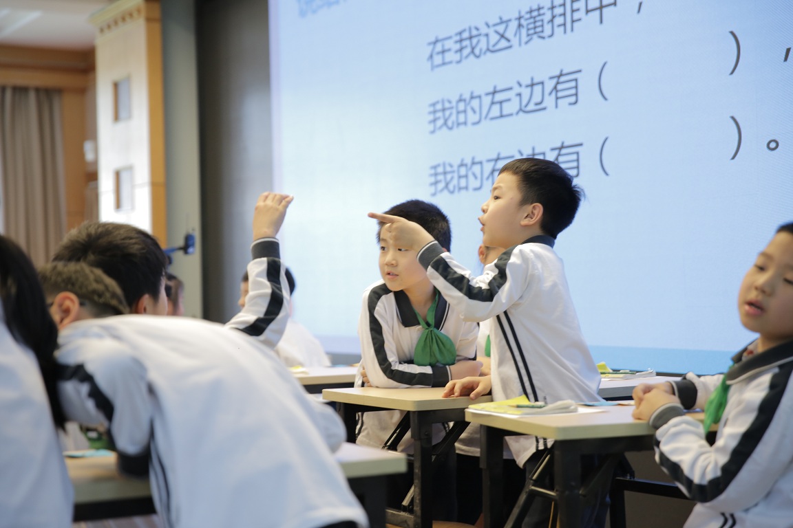朱老师从学生的认知发展水平和已有的知识经验基础上入手,先让学生认识自身的左右,再认识他人的左右;先认识一排范围内的左边右边,再认识全班范围内的左边右边。教学设计以点到面,由浅入深,层层推进。(照片3、4、5)