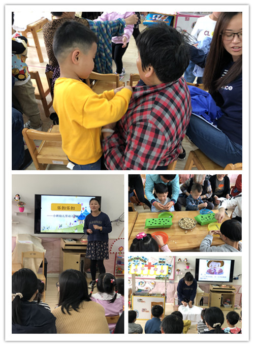 面对小、中、大班不同年龄段的幼儿及其家长,幼儿园以“循环指导”为主要形式,开展了三场有针对性的家教指导活动。在小班组的家教指导活动中,通过“乐扣乐扣”、“剥花生”以及“送玩具回家”三个活动,让家长了解培养幼儿生活自理能力以及劳动能力的科学方法。