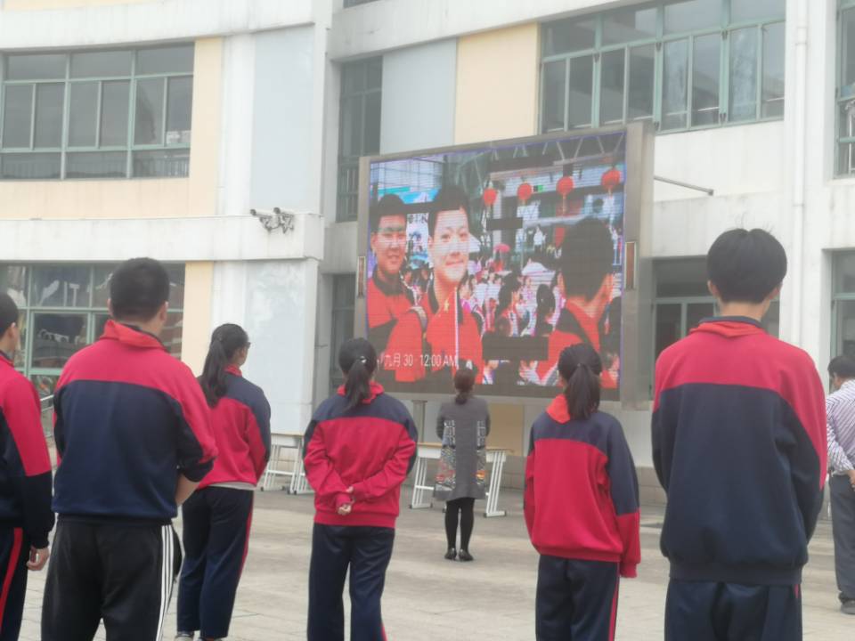 全体师生一起欣赏学校大屏幕播放着的九年级同学成长历程视频《高境四中的日子》。老师们悉心记录下同学们的成长点滴:朗诵比赛上自信飞扬的身姿、运动场上坚定执着的步伐、课堂上聚精会神的背影、春秋游时明媚动人的笑颜、篮球赛上一跃灌篮的畅快……同学们凝神欣赏这些被老师们悉心珍藏的青春岁月,神情中流露对同伴的不舍、对老师的感谢、对母校的流连、对未来的展望。