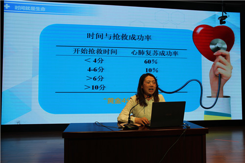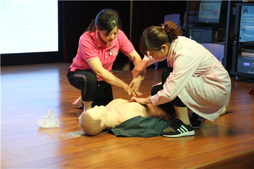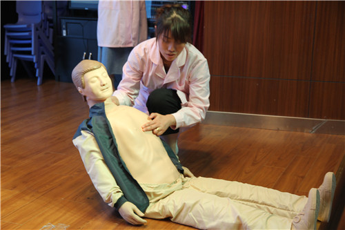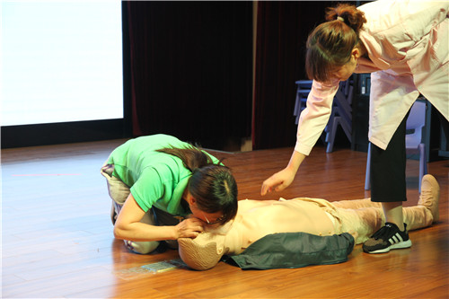 培训内容分两个部分:第一部分由小林老师讲解急症救助的特点、方法、步骤以及需要配合专业救助人员的措施等。接着由陈老师进行了具体、生动、细致的演示心肺复苏救助的步骤。第二板块是参加培训的老师们分批进行现场心肺复苏救助的操作演练。