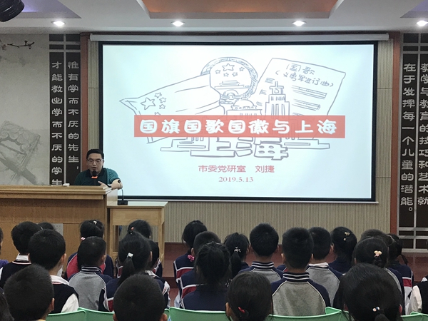 5月13日,“红色印记”党团史教育校园行活动来到我校。此次活动我们邀请到了市委党研室的刘捷老师来为我们师生讲述《国旗、国歌、国徽与上海》的故事。刘老师图文并茂的从国旗是在上海设计的——“国旗之父”;国歌是在上海创作的——“黄金搭档”;国徽是上海宝山人制作的——“大国工匠”三个方面展开。
