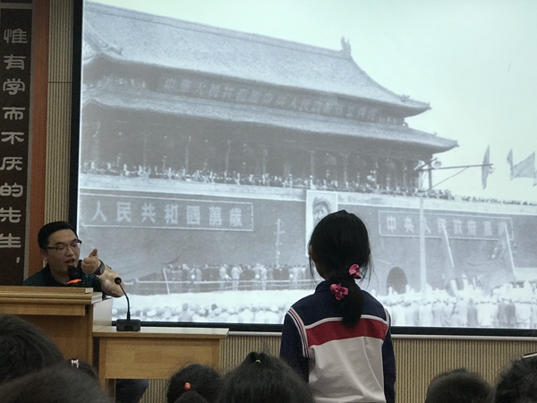1949年10月1日,毛主席在天安门城楼按下电钮,亲手升起第一面五星红旗,军乐队现场奏响了高昂激扬的《义勇军进行曲》,中华人民共和国中央人民政府宣告成立了。然而,不少人可能忽略了一个细节:在天安门城楼上,当时没有悬挂国徽。国徽与国旗、国歌一样,都是国家的标志,是国家主权与尊严的象征。那么,开国大典升起了国旗,奏响了国歌,为什么没有悬挂国徽呢?通过刘老师的讲解师生们才知道这个不为人所熟知的故事:征集图案不理想,国徽设计推迟确定。