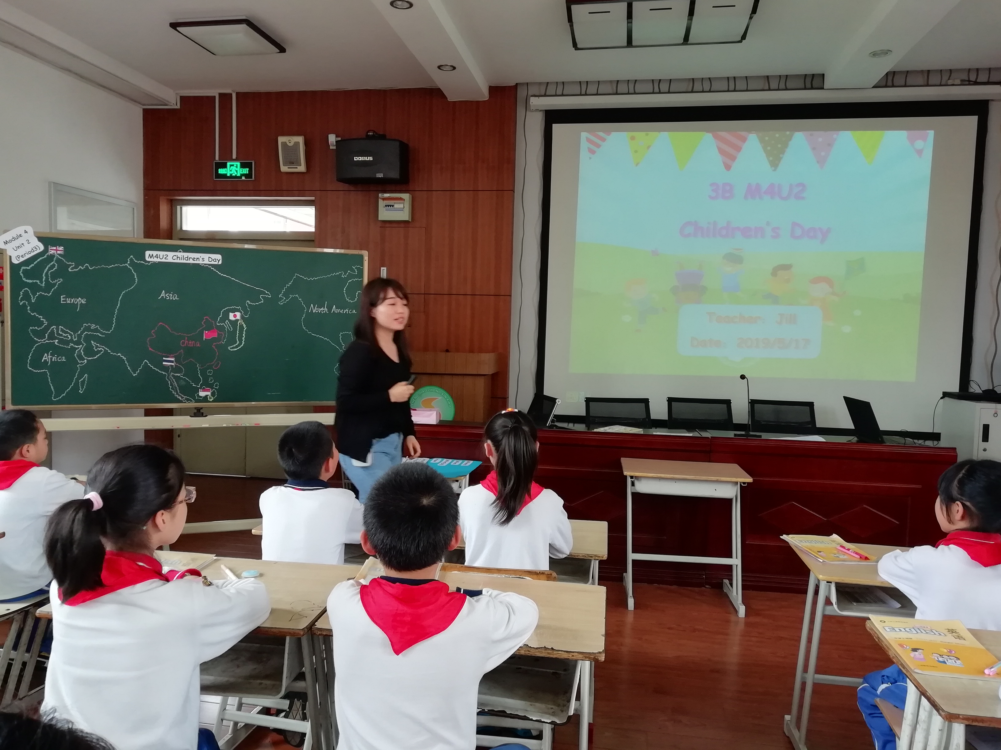 上课前,石老师对本节课作了一个简单的说课。从说学生,到说教材,再具体讲到这节课的设计是根据四封邮件来感受不同国家儿童节的日期和文化。课中,石老师在介绍四个国家的儿童节时,尽可能地让学生通过图片和视频了解不同国家的特色和儿童节的文化。在输出环节,石老师让学生通过小组讨论,选一个国家的儿童节,并根据板书来描述相应的儿童节。同时对语言表述情况给予评价,实现本课多读多说的教学目标。