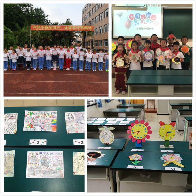 每个年级都以“展思维风采、显数学魅力”为主题进行了不同的比赛内容:一年级书写比赛;二年级钟面制作比赛;三年级运用计算器计算;四年级小数加减法口算比赛;五年级数学小报制作。