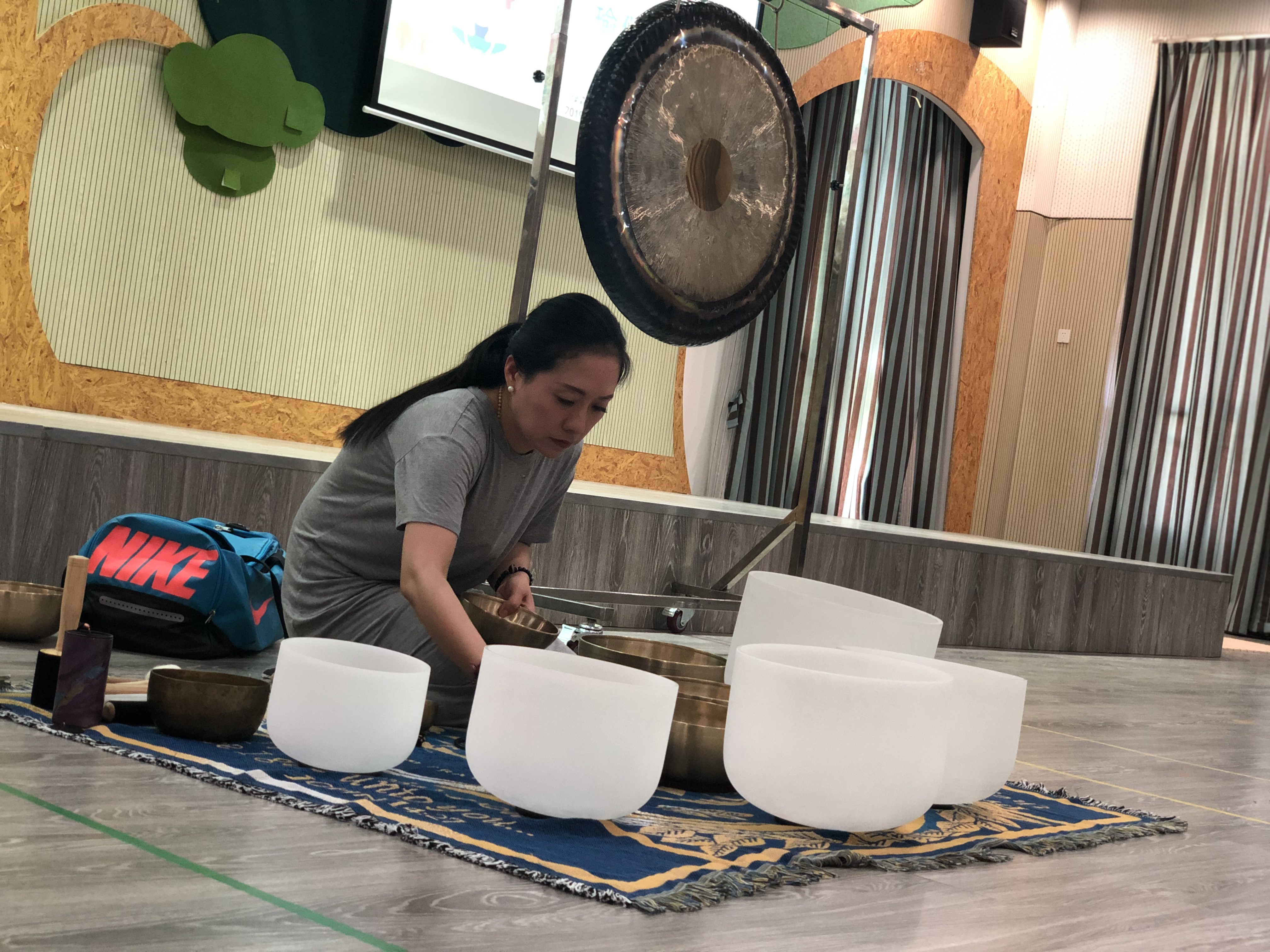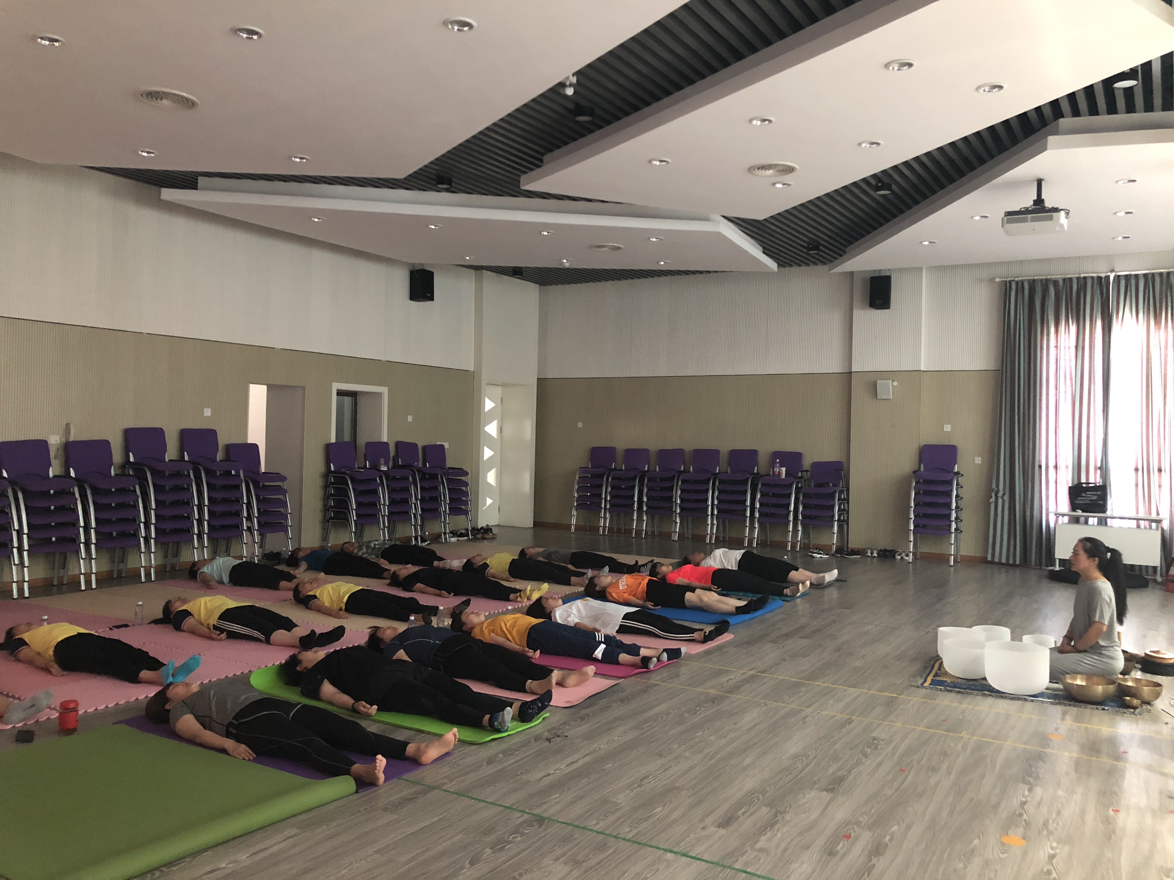 活动开始,老师们静静地闭目躺在瑜伽垫上,将注意力集中于自己的呼吸。伴随着台前老师敲出的音乐声,随着空气从鼻孔中出入,大家纷纷沉浸在自我放松的感觉中。任凭思绪涌入脑海,又轻轻将其拂去,呼吸,拂去。一个多小时的时间里,大家舒心爽志,疗愈了身心。