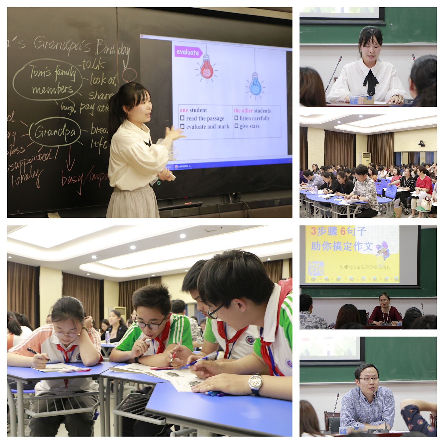 课后,王老师进行了现场说课,罗泾中学陶静老师、呼玛中学傅佼艳老师进行了精准、到位的评课。华师大宝山实验学校吴蓓丽老师进行精彩交流发言,通过三步骤、六句子对八九年级的写作进行技巧指导。
