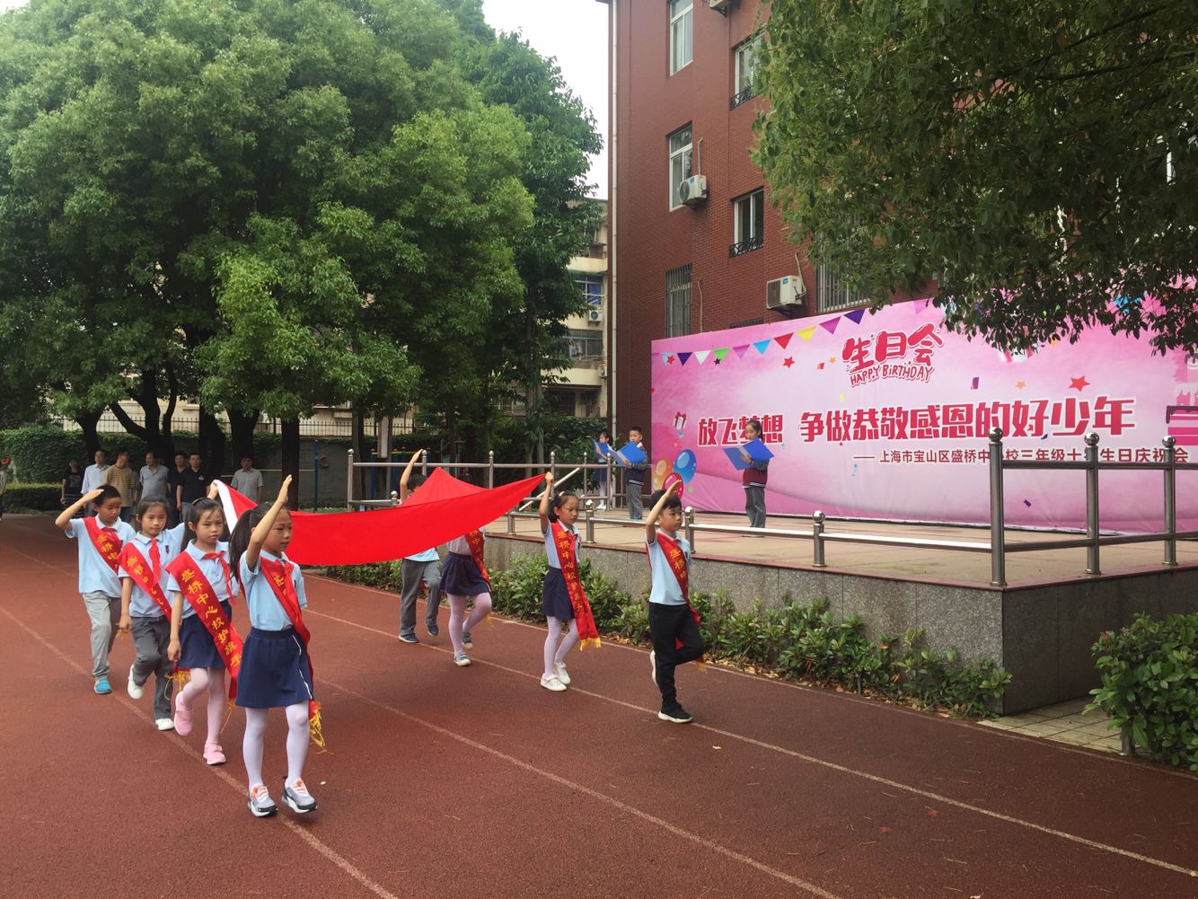 2019年5月27日,盛桥中心校全体师生在操场上举行了 “我快乐,我成长”为主题的升旗仪式。
