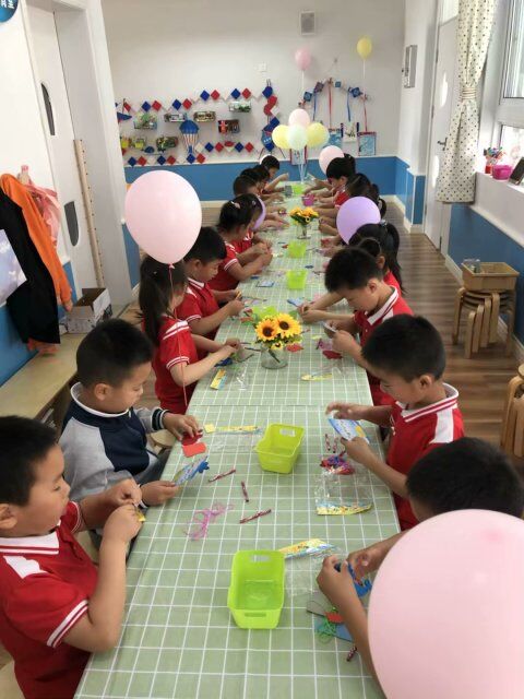活动当天,宝山工业园区的叔叔阿姨来看我们小朋友了,还给我们带来了礼物,并且还举行了捐赠仪式,与此同时小中大班的儿童节活动也正有条不紊的进行着,小班此次的活动老师们针对幼儿的年龄设计了打水仗及DIY眼镜制作,中班则是制作风车,而我们大班是DIY风铃,孩子们都乐在其中,玩的不亦乐乎。午餐时间我们采用了自助餐的形式,让孩子们体验了一把当家作主的感觉。
