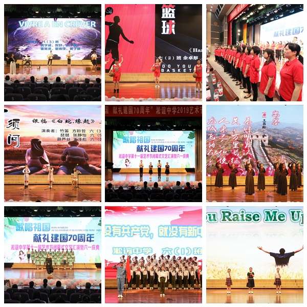 六年级的歌舞《今天是你的生日》拉开了文艺汇演的序幕,动听的歌声、创意的表演,让下面的观众眼前一亮;七(2)班带来的篮球操,燃爆全场;八(1)的创意朗诵《沁园春.长沙》少年之意气风发扑面而来;六(5)班配音小达人表演的动画配音,一人分饰多角,技惊四座……最后全场师生合唱《我和我的祖国》更是将整个汇演推向了巅峰!